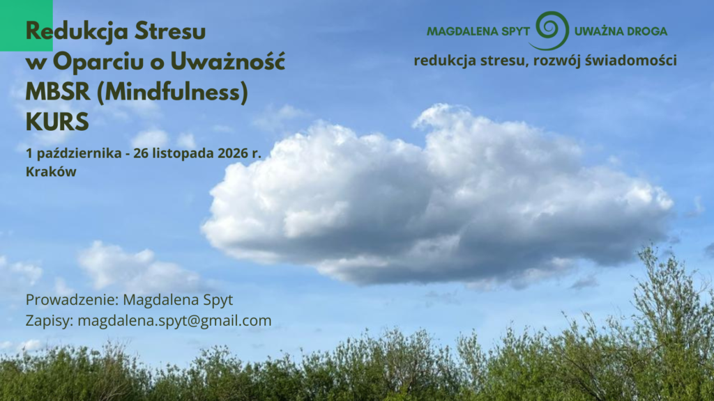 (2)Certyfikowany, klasyczny KURS REDUKCJI STRESU W OPARCIU O UWAŻNOŚĆ (MBSR) W KRAKOWIE: 1 października – 26 listopada 2026 (czwartki), stacjonarnie. Szczegóły poniżej.