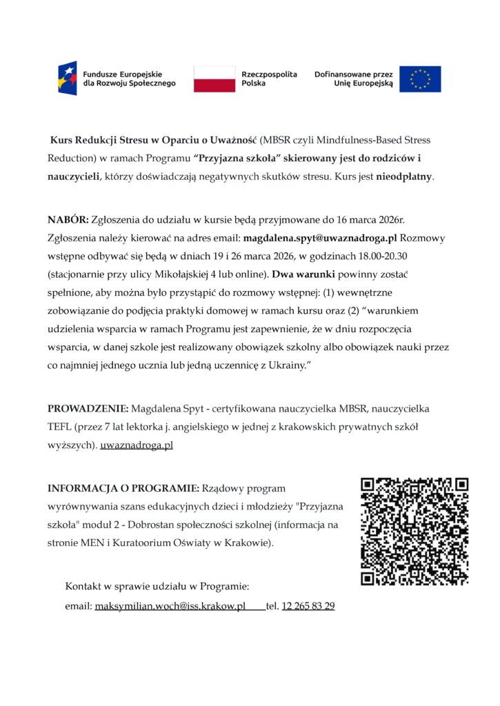 Zapraszam serdecznie rodziców i nauczycieli do Krakowa na BEZPŁATNY, stacjonarny kurs Redukcji Stresu w Oparciu o Uważność (MBSR), który poprowadzę W RAMACH rządowego PROGRAMU „PRZYJAZNA SZKOŁA”. Obszar: Województwo małopolskie. Warunek bezwzględny: przynajmniej jeden uczeń w szkole rodzica, nauczyciela jest z Ukrainy. Ogólne informacje znajdziesz na załączonym zdjęciu, szczegółowe w treści poniżej. Jeśli możesz, podaj proszę dalej. Zgłoszenia do 16 marca. Kurs potrwa od kwietnia do września 2026 r.